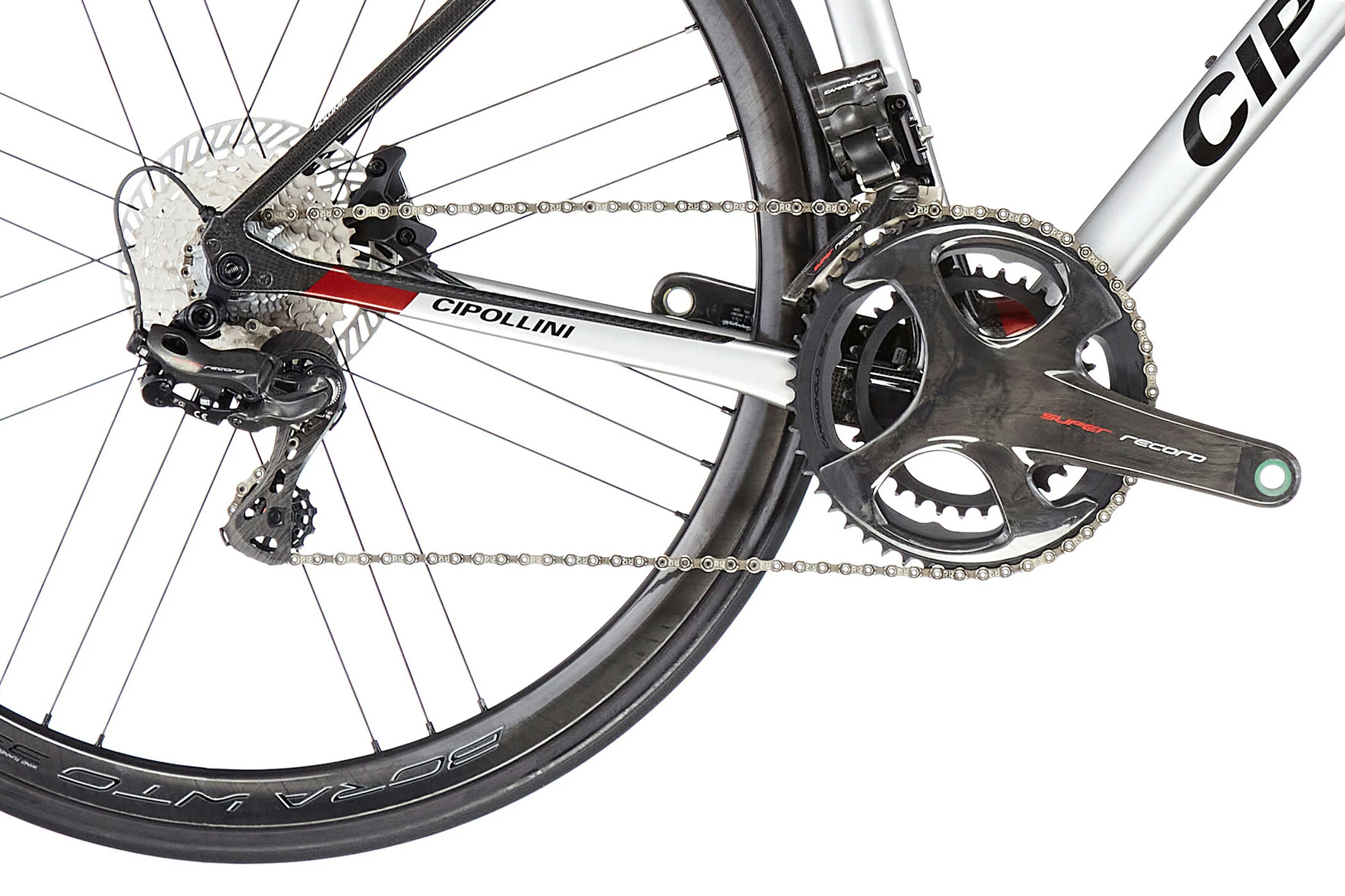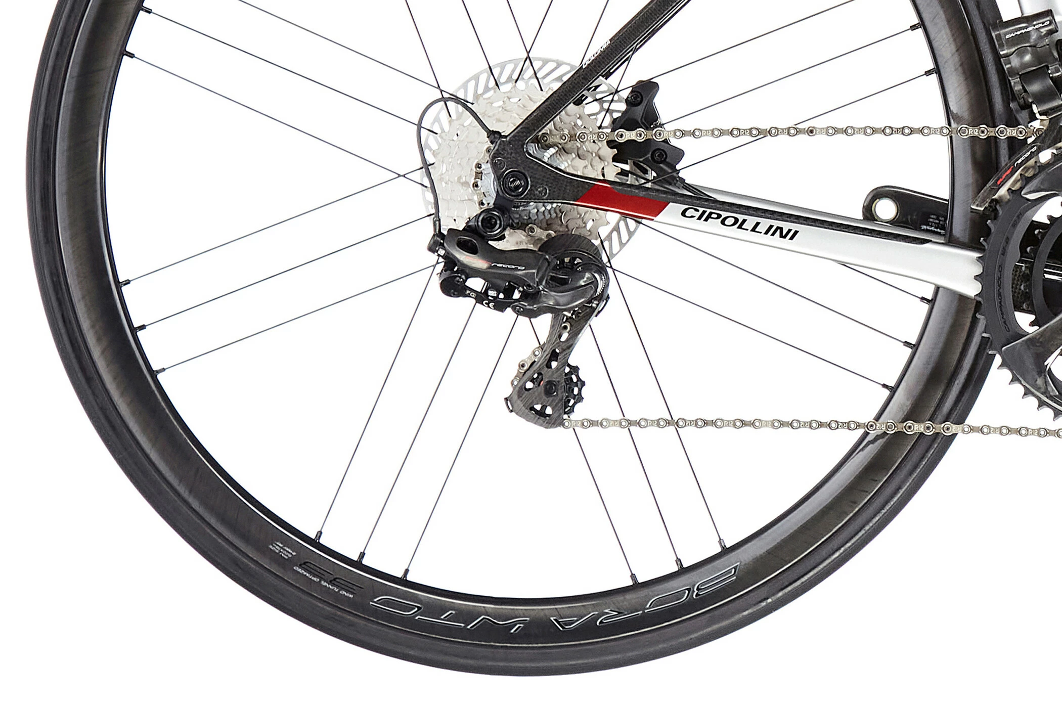 Mens traditionsbevidste italienske mærker længe har været tilbageholdende med at montere skivebremser på racercykler, benytter Cipollini sig nu også af de fremragende, kontrollerbare hydrauliske skivebremser af mærket Campagnolo.