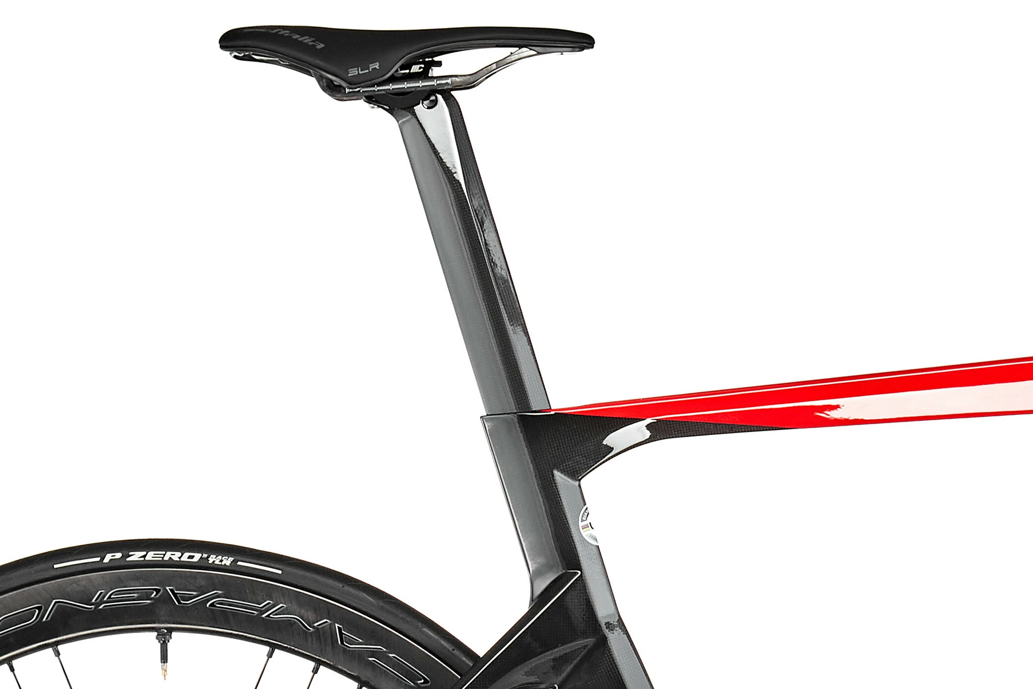 Monocoque carbonrammen med 1K-finish er aerodynamisk optimeret, hvilket du kan se ved første øjekast på sædet og det forreste underrør, som omslutter dækkene tæt som en tidskørselscykel. Den aerodynamiske sadelpind med integreret sadelpindsklemme fortsætter dette designsprog.