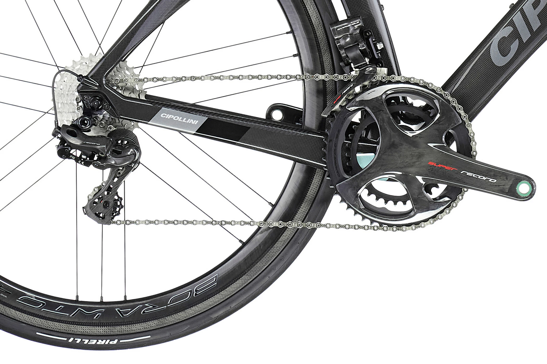 Denne version af One er udstyret med Campagnolo Super Record bremsefælge og er helt igennem italiensk: Super Record EPS, flagskibet blandt Campagnolos elektroniske skiftesystemer, er blevet installeret. Campagnolo var banebrydende inden for indførelsen af 12-trins gear på landevejscykler i den mekaniske version, og mærket var også det første til at følge trop med elektroniske gear. Med den ædle og lette Super Record EPS får du det fineste materiale og en fremragende gearskifteevne. Her er der brugt en del carbon og titanium. De ergonomiske gearskift ligger godt i hånden, hvorved der kun kræves meget lidt betjeningskraft, og der kan skiftes flere gear samtidig. Du får et fint gradueret gearspektrum samt en masse tilpasnings- og analysemuligheder via eksternt interface, “My Campy”-appen og smartphone eller cykelcomputer. Tolv gear med en klassisk og kompakt krumtap med 50 og 34 tænder på de forreste kædeblade i kombination med en kassette med 11 til 32 tænder giver dig mulighed for at finde det helt rigtige gear i enhver situation.