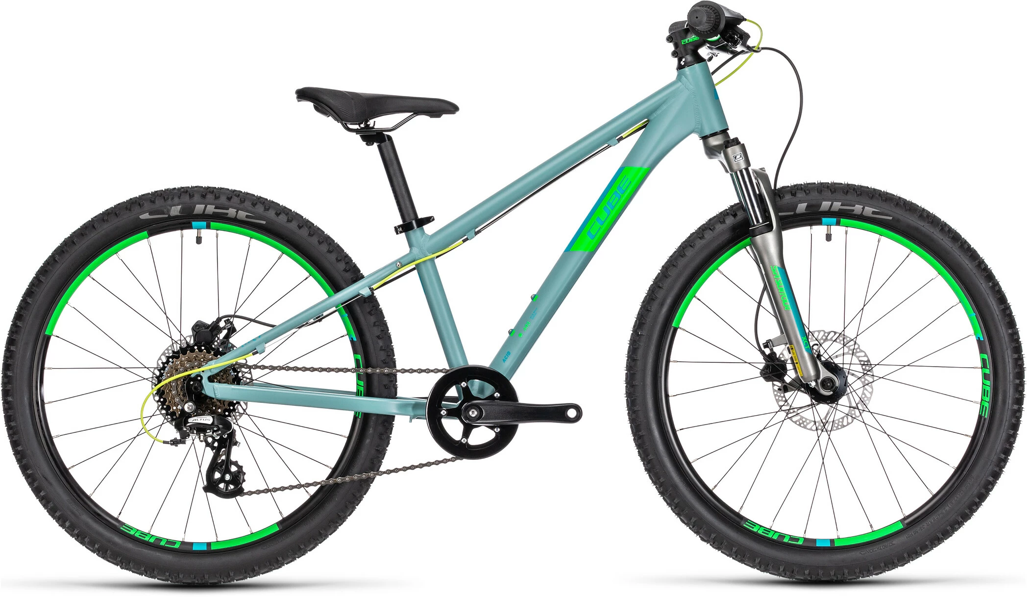 Acid 240 Discs stel er bygget af de samme varmebehandlede 6061 aluminiumsrør som voksencyklerne og er lige så robust som en mountainbike i fuld størrelse, men med den rette vægt og de rette proportioner til et barn. Skivebeslag gør det muligt at bruge disse kraftfulde, sikre og brugervenlige bremser. Der er en flaskeholder til forfriskning midt på turen og også monteringer til rack. Styringen er designet til at være både sjov og tillidsvækkende. Og fordi Cube ved, at ulykker kan ske, har de gjort det nemt at udskifte gearophænget, så et slag eller et styrt ikke behøver at resultere i en dyr reparation.