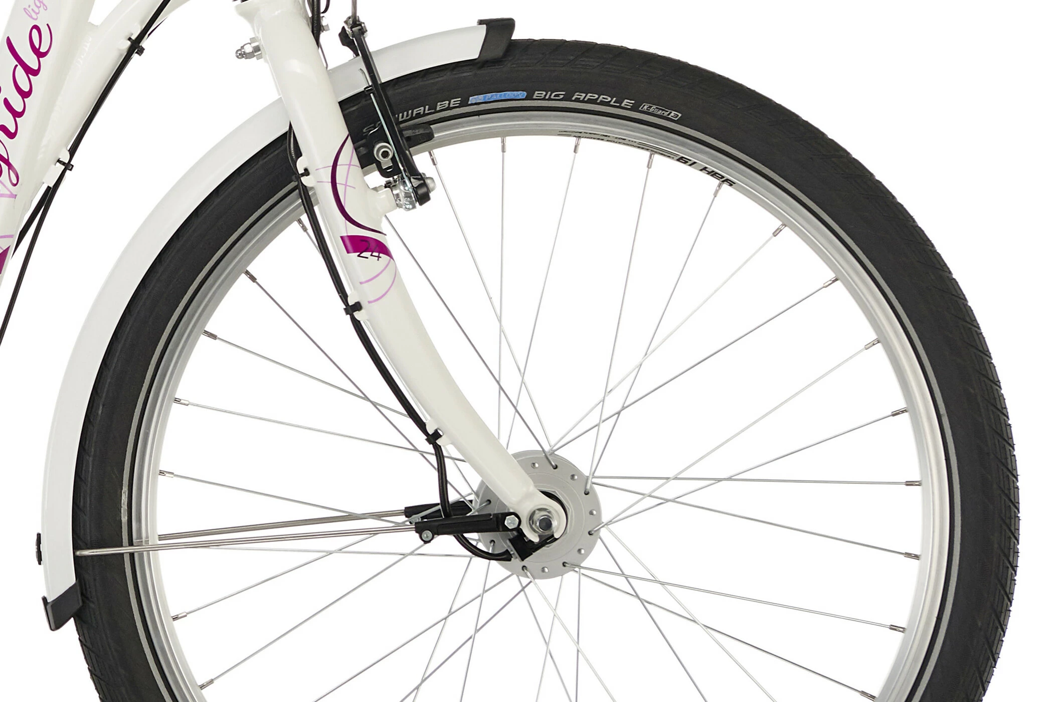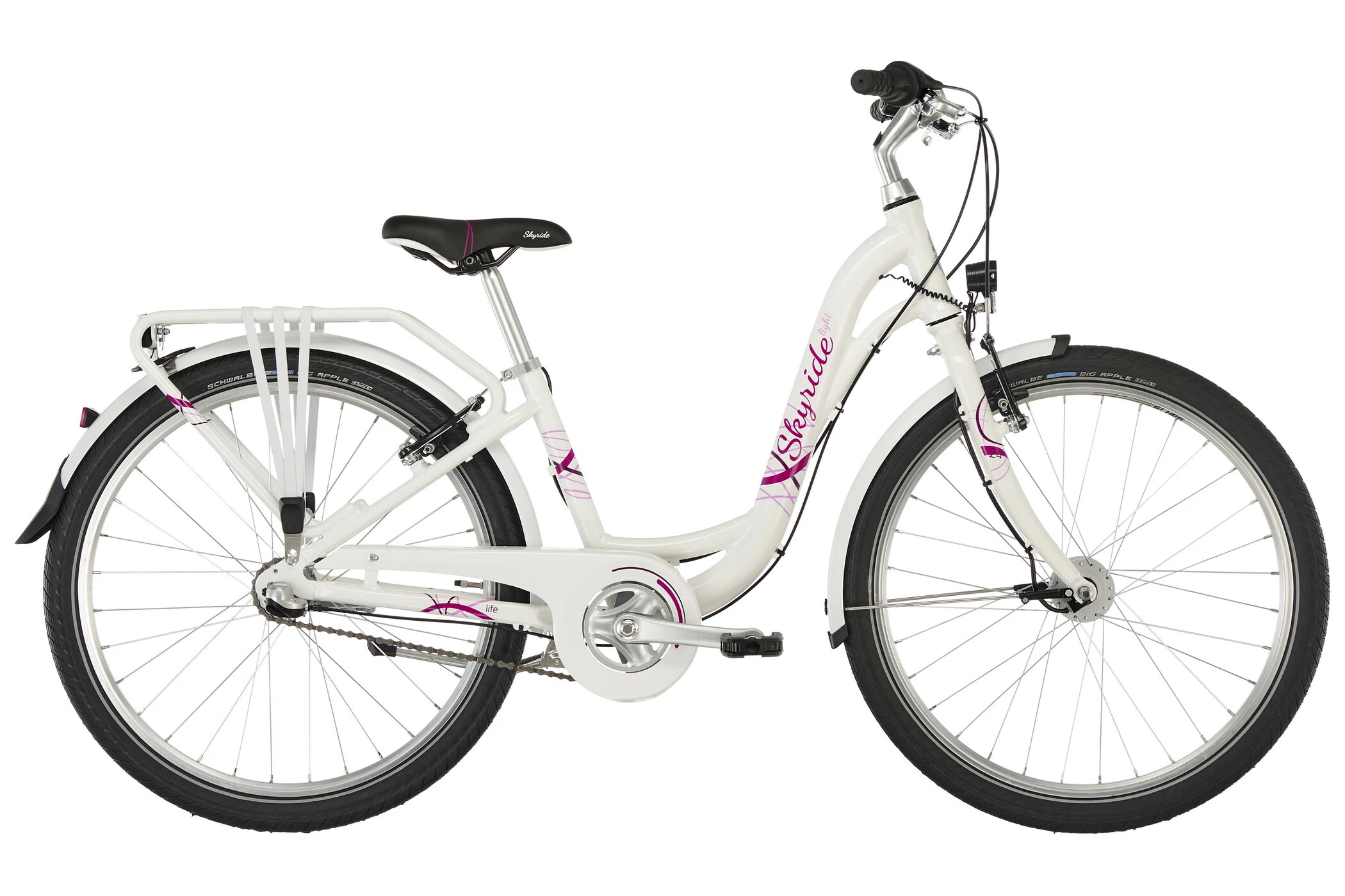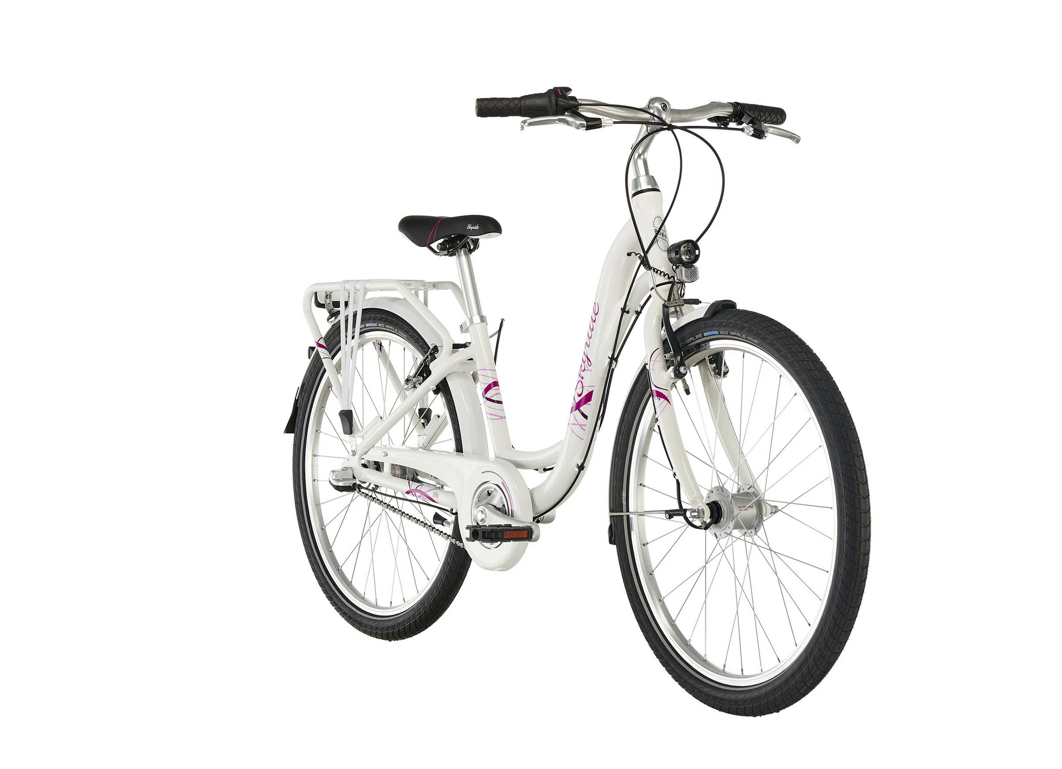 PUKY SKYRIDE 24-3 ALU skinner i tre spændende farver hvid, berry og i Classic Line himmelblå / beige, hvilket gør alle piger varme om hjertet. Men ikke kun designet er overbevisende. Det er også de mange gennemtænkte tekniske detaljer, der gør denne cykel til en ægte PUKY. Aluminiumbagagebærer med integreret racktime kobling, LED-forlygten med automatisk on / off, de anodiserede aluminiums aero fælge eller Schwalbe Big Apple dæk af høj kvalitet. Funktionenerne på denne cykel er på ingen måde begrænset af det flotte ydre.