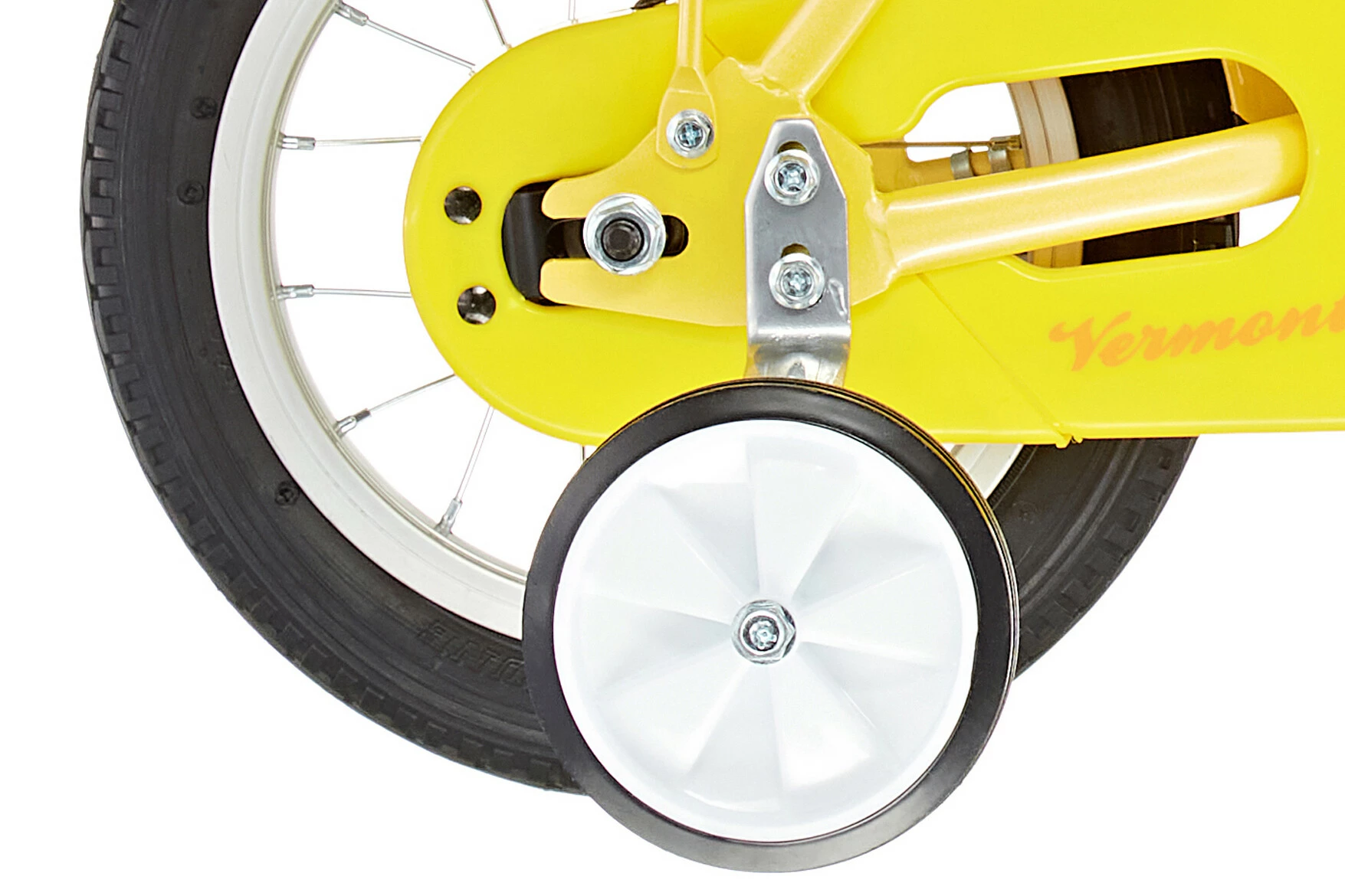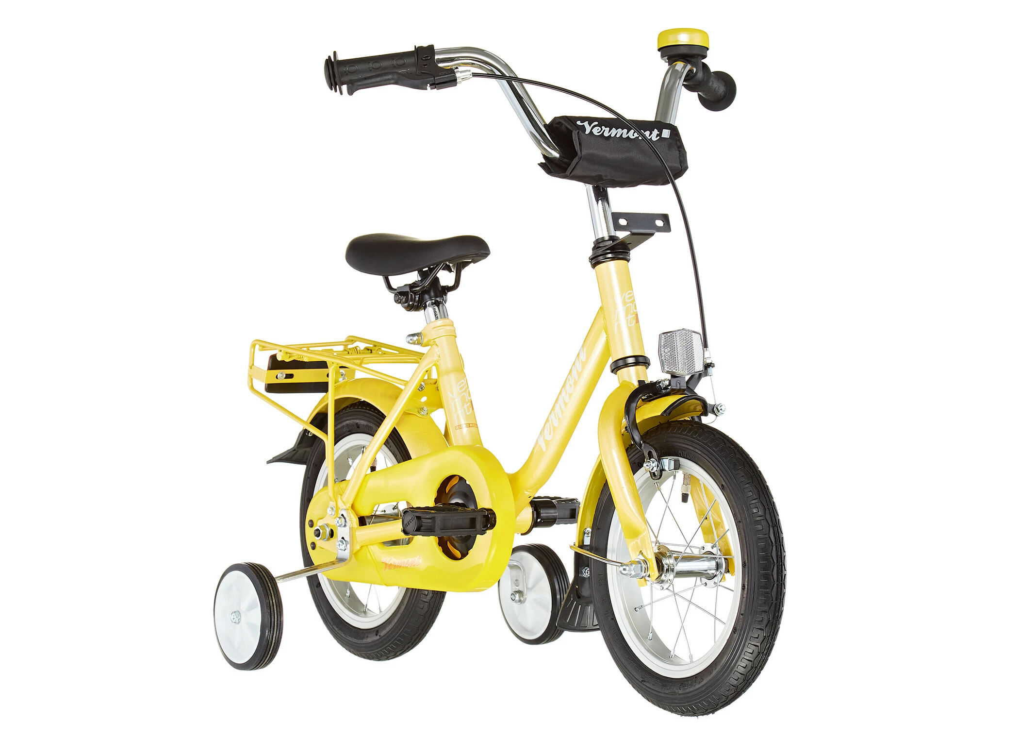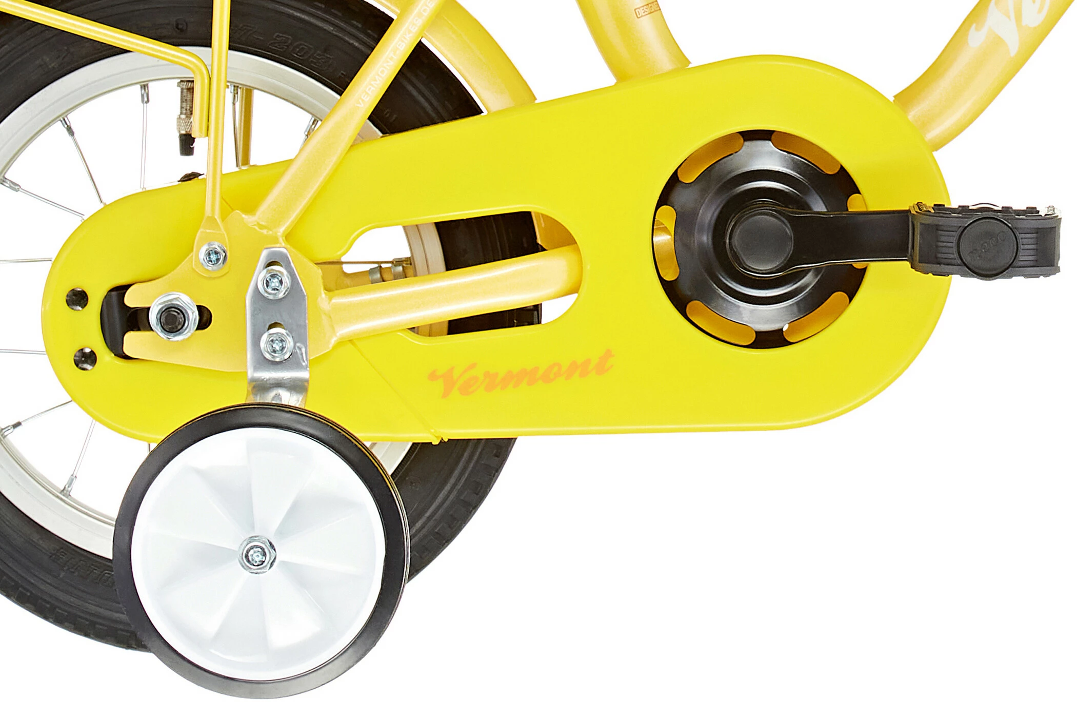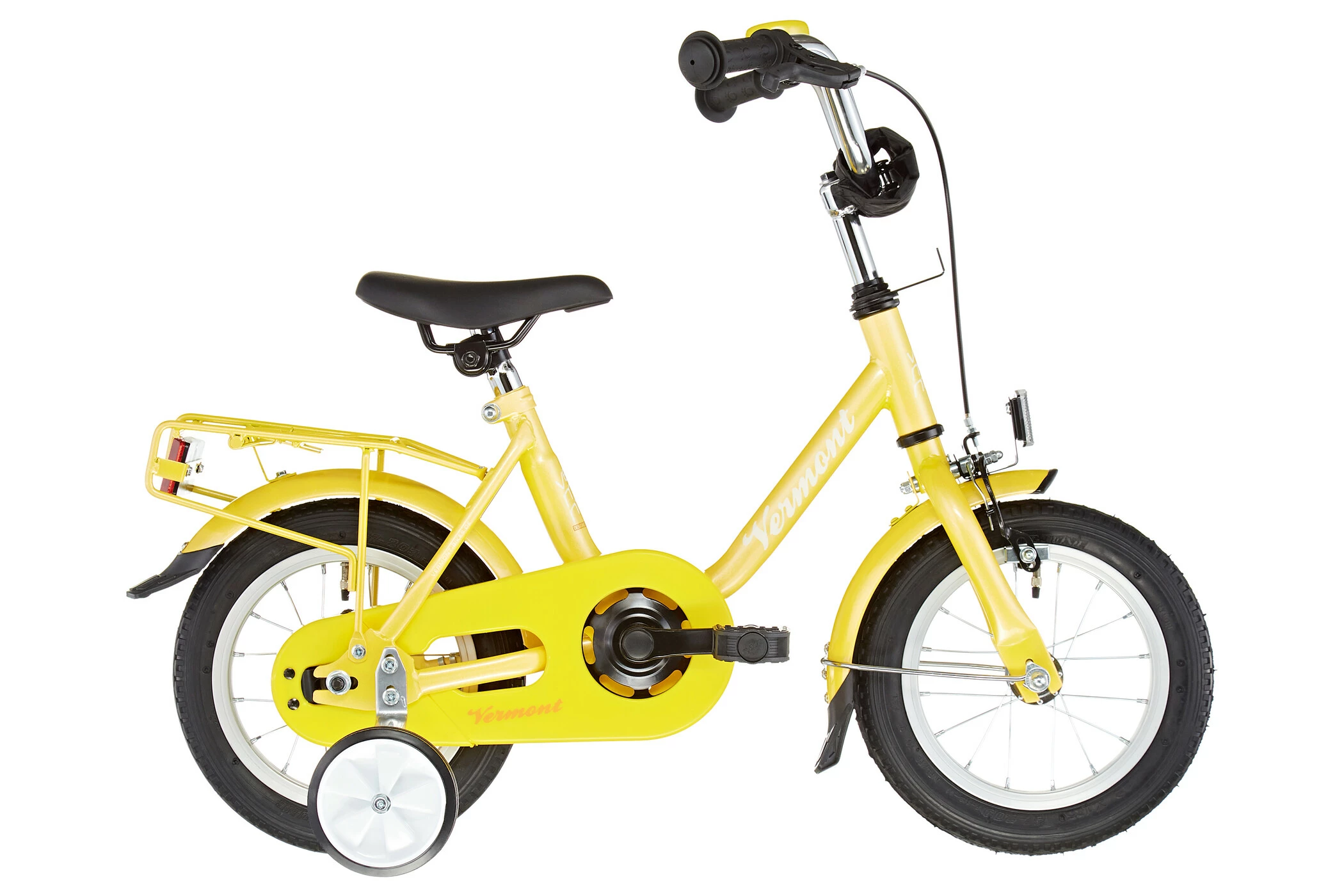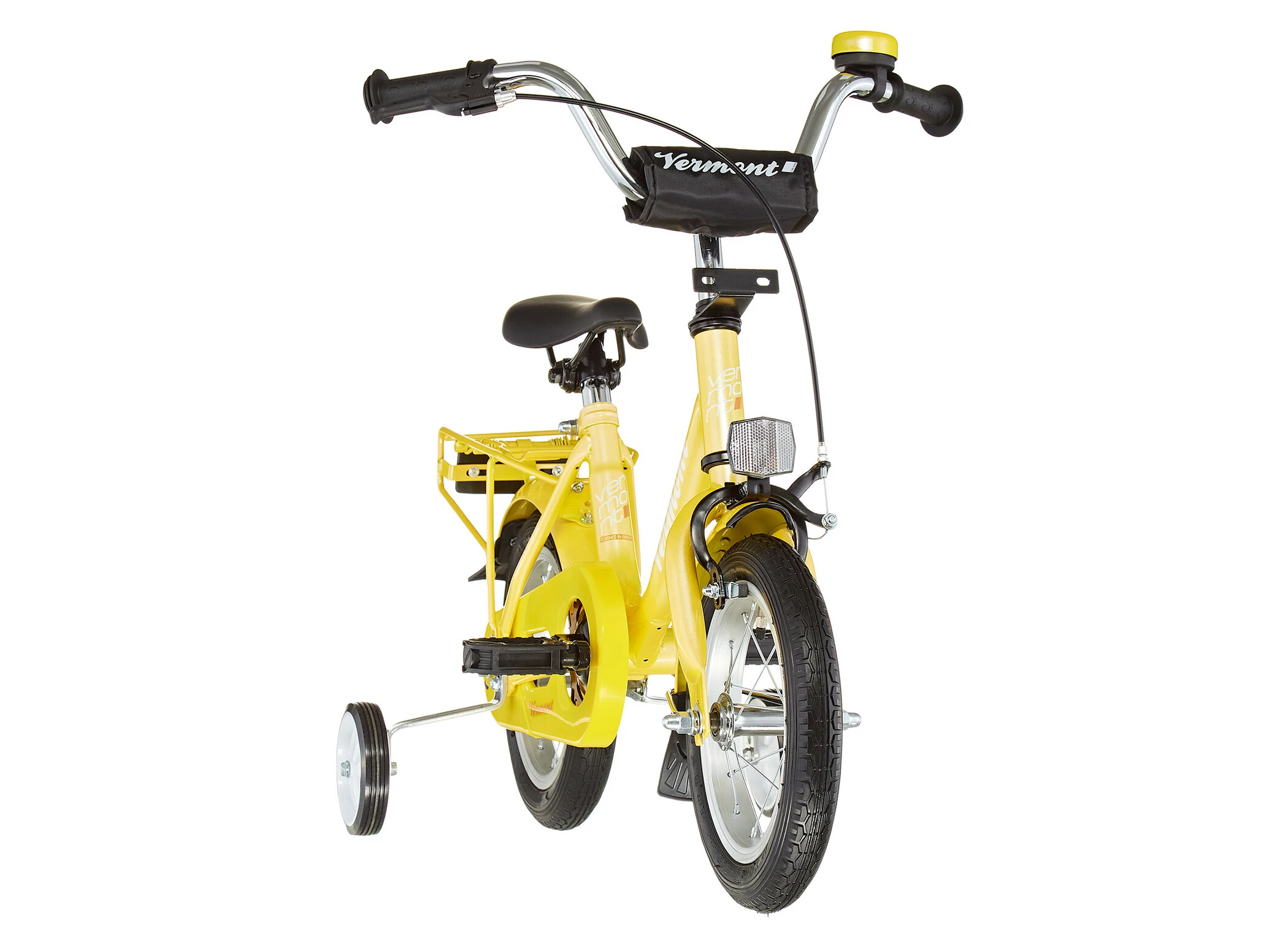 Den cool Vermont Classic 12″ imponerer ikke kun med sit retro-look, men frem for alt med sin kvalitet og sine nyttige detaljer. Ud over en ramme med et lavt indstigningsniveau har Vermont-børnecyklen robuste aluminiumsfælge, coasterbremser og forbremser med børnevenligt justerbare bremsegreb og en forhjulspude. Et andet højdepunkt er den seje bagagebærer, så erobringerne også kan transporteres. Stænkskærmene, der er farvekoordineret med rammen, beskytter også børnene mod mudder og snavs på deres ture. Takket være kædebeskytteren bliver bukserne ikke fanget i kæderne og bliver ikke beskidte på samme tid. Men der er også taget hensyn til begyndere: et sæt træningshjul er inkluderet for at gøre det lettere for børnene at komme i gang.